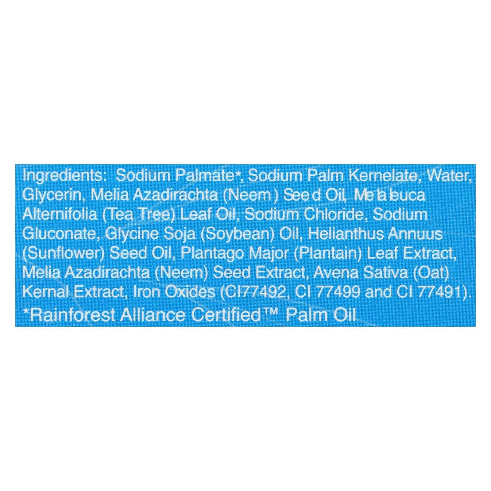 ingredients : sodium palmate;sodium palm kernelate;water;glycerin;melia azadirachta (neem) seed oil;melaleuca alternifolia (tea tree) leaf oil;sodium chloride;sodium gluconate;glycine soja (soybean) oil;helianthus annuus (sunflower) seed oil;plantago major (plantain) leaf extract;melia azadirachta (neem) seed extract;avena sativa (oat) kernal extract;iron oxides (ci77492, ci 77499 and ci 77491)
