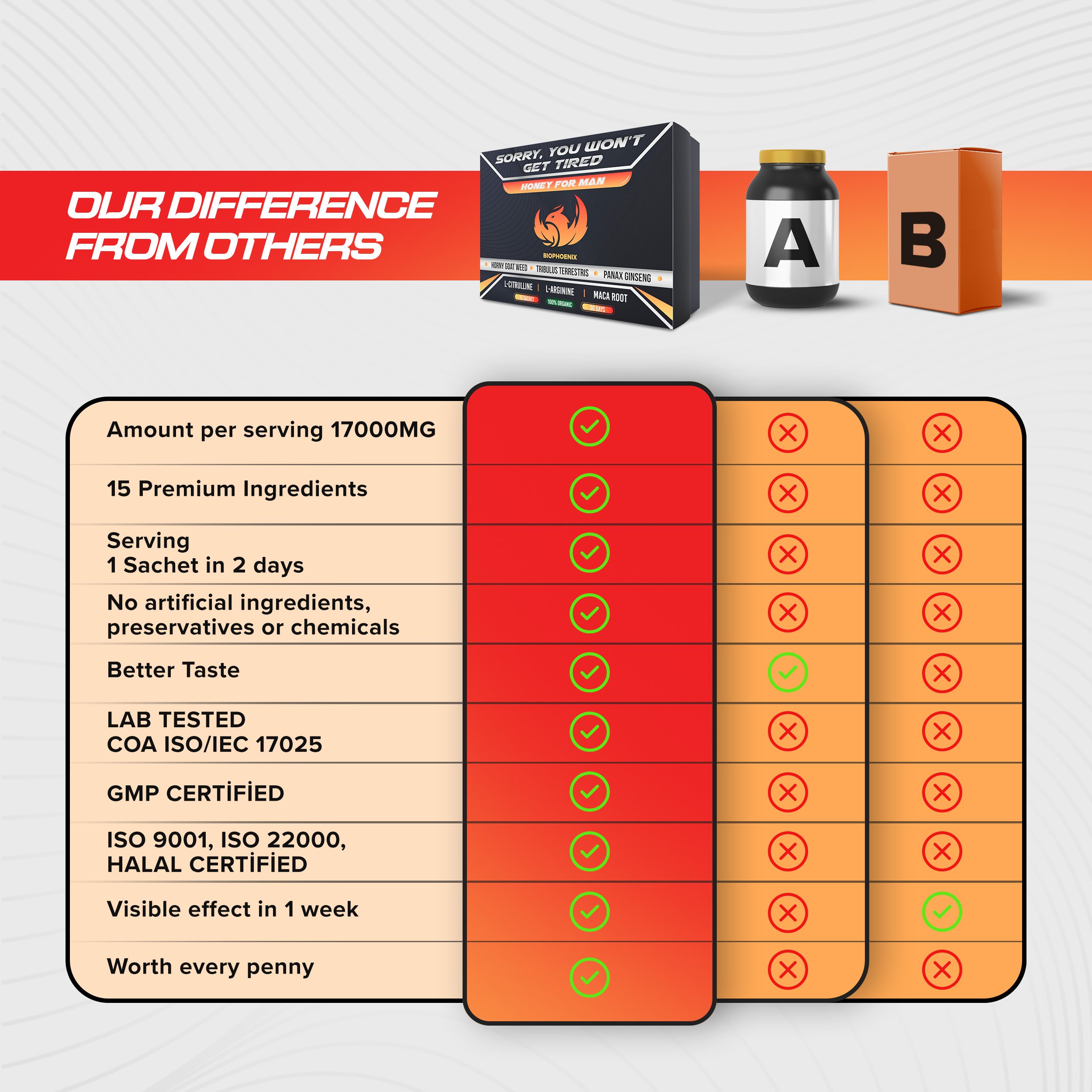 SORRY, WON'T GET TIRED - Our product, Testosterone booster honey for men and women, helps you to continue your day, no matter how tiring activities you experience in your daily life. At the same time, these honey packs for men and women increase daily gym performance. Take 1 honey stick every 2 days after breakfast. If you need more energy you can get it every day. Honey for men product with the strongest ingredients.15 IMPORTANT INGREDIENTS FOR INCREASING TESTOSTERONE - Testosterone booster for men, or honey for men by combining all the important ingredients with honey: - Tribulus Terrestris for men improves gym and daily performance. It is also testosterone booster for men. - Horny Goat Weed for men is a solution for low libido. - Maca Root plays the role of testosterone booster for men but also boosting energy and libido.Ginseng maximizes daily energy level and it is testosterone booster for men. L Arginine & L Citrulline supplements have increased testosterone levels after training. L Citrulline & L arginine are testosterone supplements for men. Also make Fast Recovery at gym sessions. Saw Palmetto prevents the conversion of testosterone to dihydrotestosterone. Thus, Saw Palmetto extract prevents prostate enlargement and prevents hair loss.INCREASES YOUR PERFORMANCE TO THE HIGHETS LEVEL - ENERGY, STAMINA, ENDURANCE, STRENGTH and provides extra POWER and PERFORMANCE during heavy gym sessions and other activities. The 15 honey sticks it contains are natural energy supplements for women and men who want to live their lives more energetically and actively. Anyone over 18 can use it.GMP, ISO & COA CERTIFIED - As the first company to produce organic honey for men, our honey sticks are GMP compliant to ensure premium quality. Our COA certificate proves that there are no harmful chemicals in the product and organic testosterone supplement for men. No wheat, no gluten, no dairy, no sugar, no soy, and no yeast. All other ingredients in our product - zinc, vitamin e, fenugreek, ferula and etc. It plays the role of a direct testosterone booster for men.