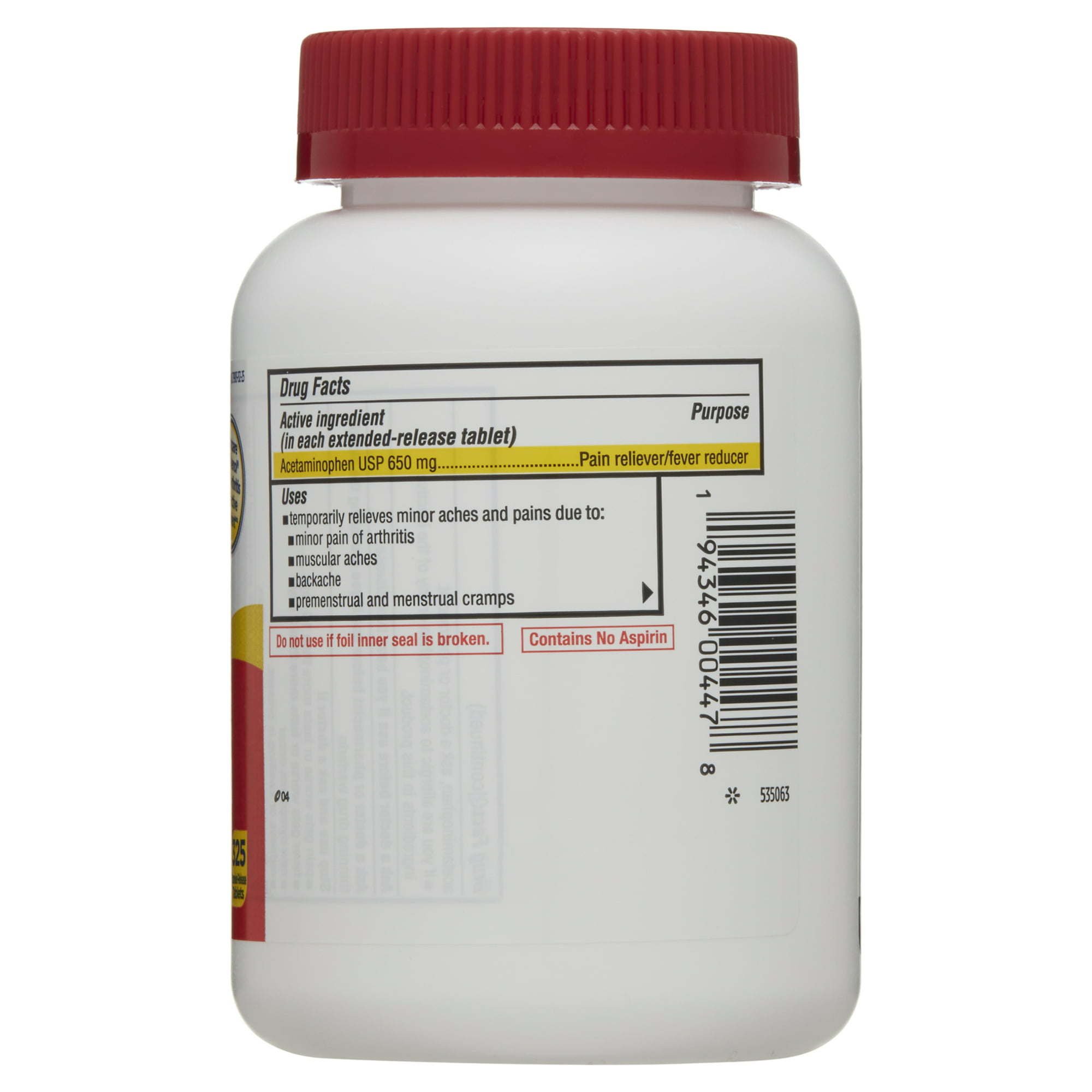 TEMPORARY PAIN RELIEF: This product may also be used to temporarily relieve other minor aches and pains due to: muscular aches; backache; premenstrual and menstrual cramps; the common cold; headache; and toothache. ACTIVE INGREDIENT: Equate Acetaminophen Extended-Release Tablets; 650 mg active ingredient is acetaminophen 650 mg. Compare to the active ingredient in Tylenol 8HR Arthritis Pain PURPOSE: Equate Acetaminophen Extended-Release Tablets; 650 mg is a pain reliever and fever reducer that can be used for the temporary relief of minor pain of arthritis