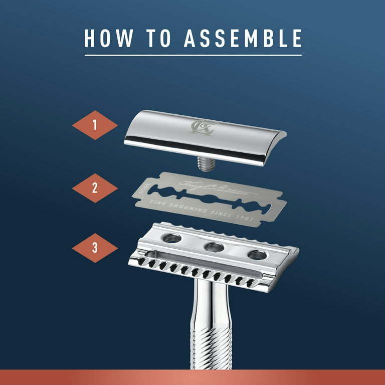 The pinnacle of over a century's worth of innovation and expertise, and the only range that bears the name of our company's founder: King C. Gillette. This safety razor for men is an iconic design inspired by our heritage, for edging with ultimate precision, classic function and style. A single platinum coated double edged safety razor blade shapes with precise accuracy, ideal for edging sideburns and strong beard lines to help you achieve your perfect look. Our closed comb head design, perfected a century ago, allows for great control, while the high-quality chrome plated handle ensures long-lasting durability. Includes 5 platinum coated stainless steel double edged razor blades for a precision finish and lasting durability. HOW TO INSERT A NEW BLADE: First, hold the razor upside down, unscrew the handle and lift off the blade guard and old blade. Second, place a new blade on to the cap using the central screw and two location posts to keep the blade straight. Lastly, replace the guard and reattach the handle by turning clockwise until fully tightened.