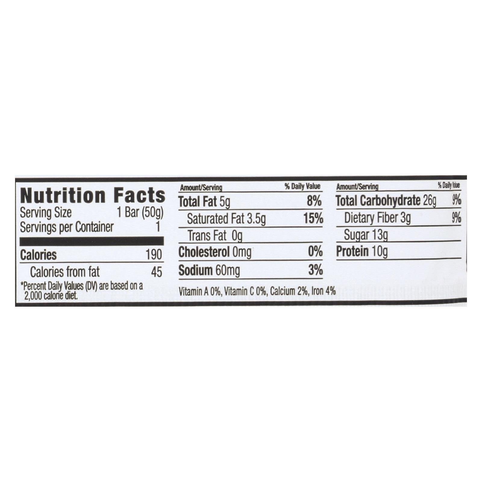 ingredients : organic crunch [organic hexane free soy crisps;organic soy protein;organic rice flour;calcium carbonate;organic brown crisp rice;organic rolled oats];organic chocolate;organic cane sugar;organic chocolate liquor;organic cocoa butter;organic soy lecithin;organic vanilla;organic tapioca syrup;organic agave syrup;organic isolated soy protein;organic almonds;organic flaxseed;natural flavors;organic arabic gum