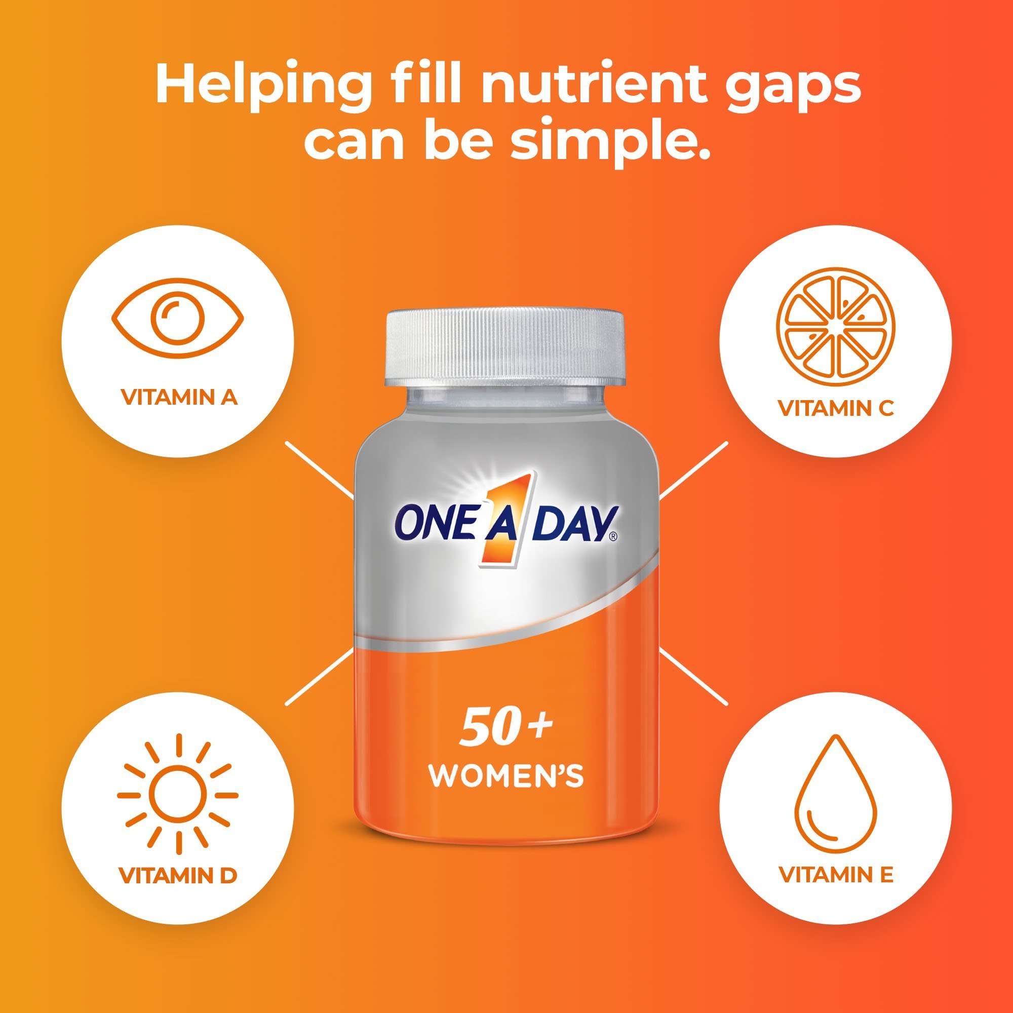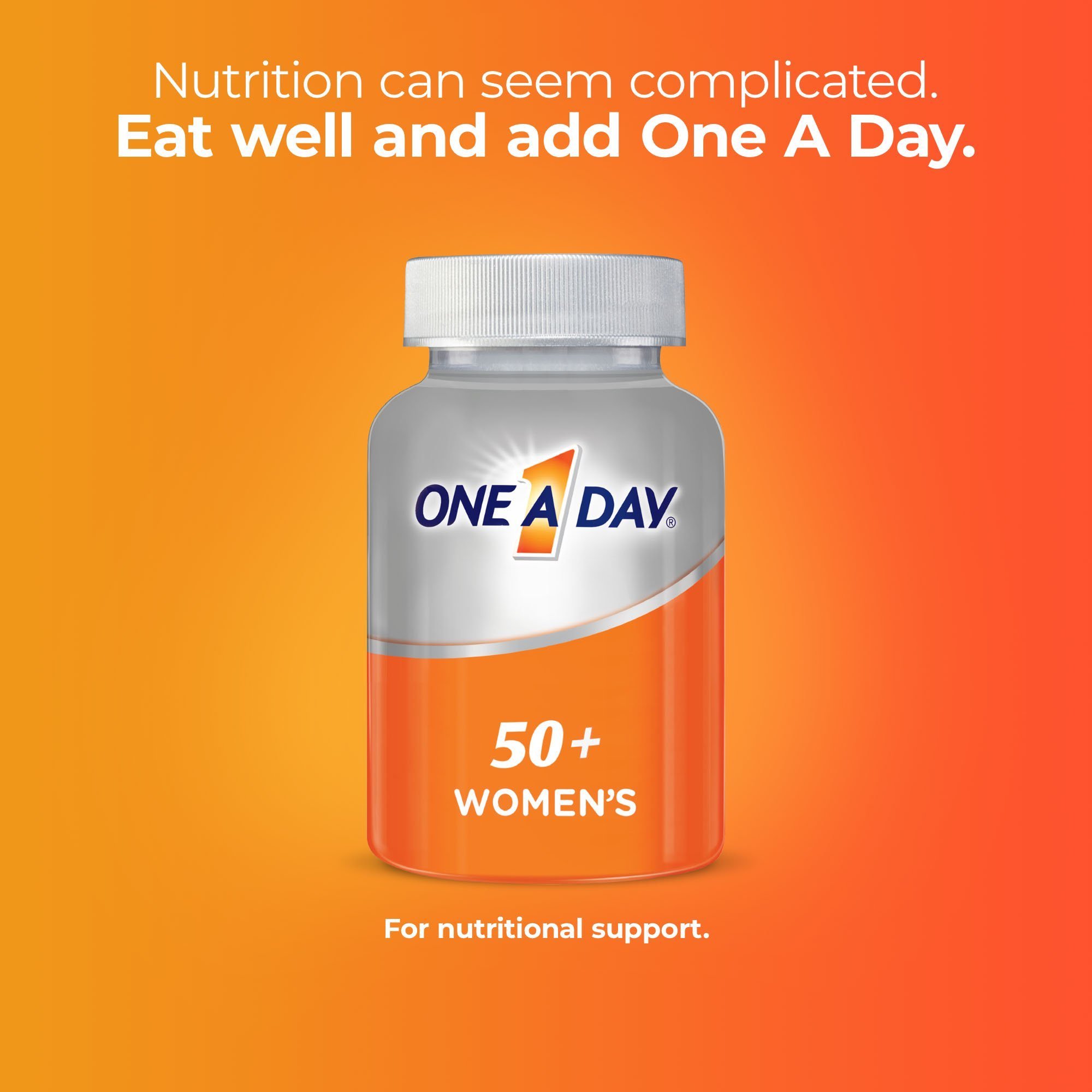 One A Day Women's 50+ Multivitamin Tablets are formulated to support:* bone health; joint health; heart health**; eye health; immune health; and physical energy by helping convert food to fuel