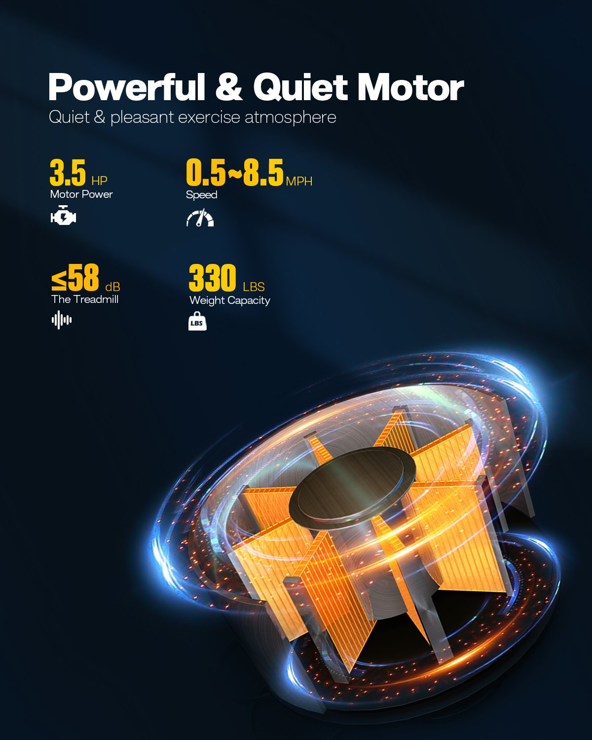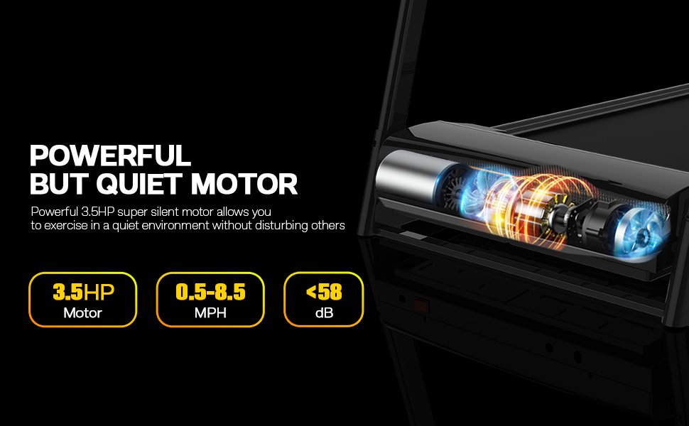 4.Powerful and Quiet Moto:This treadmill for home is equipped with a powerful 3.5 HP motor. It not only holds a 330 LBS capacity, but also up to 0.5-8.5 mph,