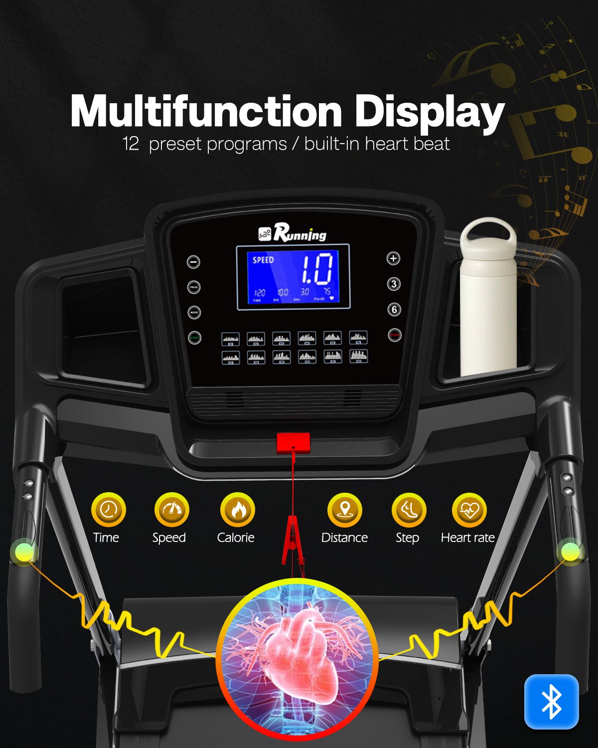 2.With Bluetooth and Phone Holder:Connect the folding treadmill to your phone through Bluetooth,so you can play music while you are exercising.