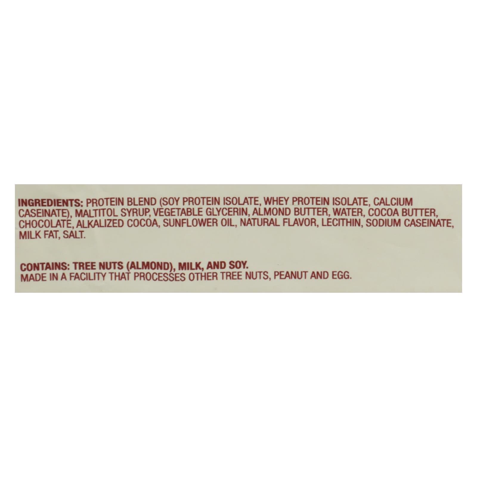ingredients : protein blend (soy protein isolate, whey protein isolate, calcium caseinate);maltitol syrup;vegetable glycerin;almond butter;water;cocoa butter;chocolate;alkalized cocoa;sunflower oil;natural flavor;lecithin;sodium caseinate;milk fat;salt