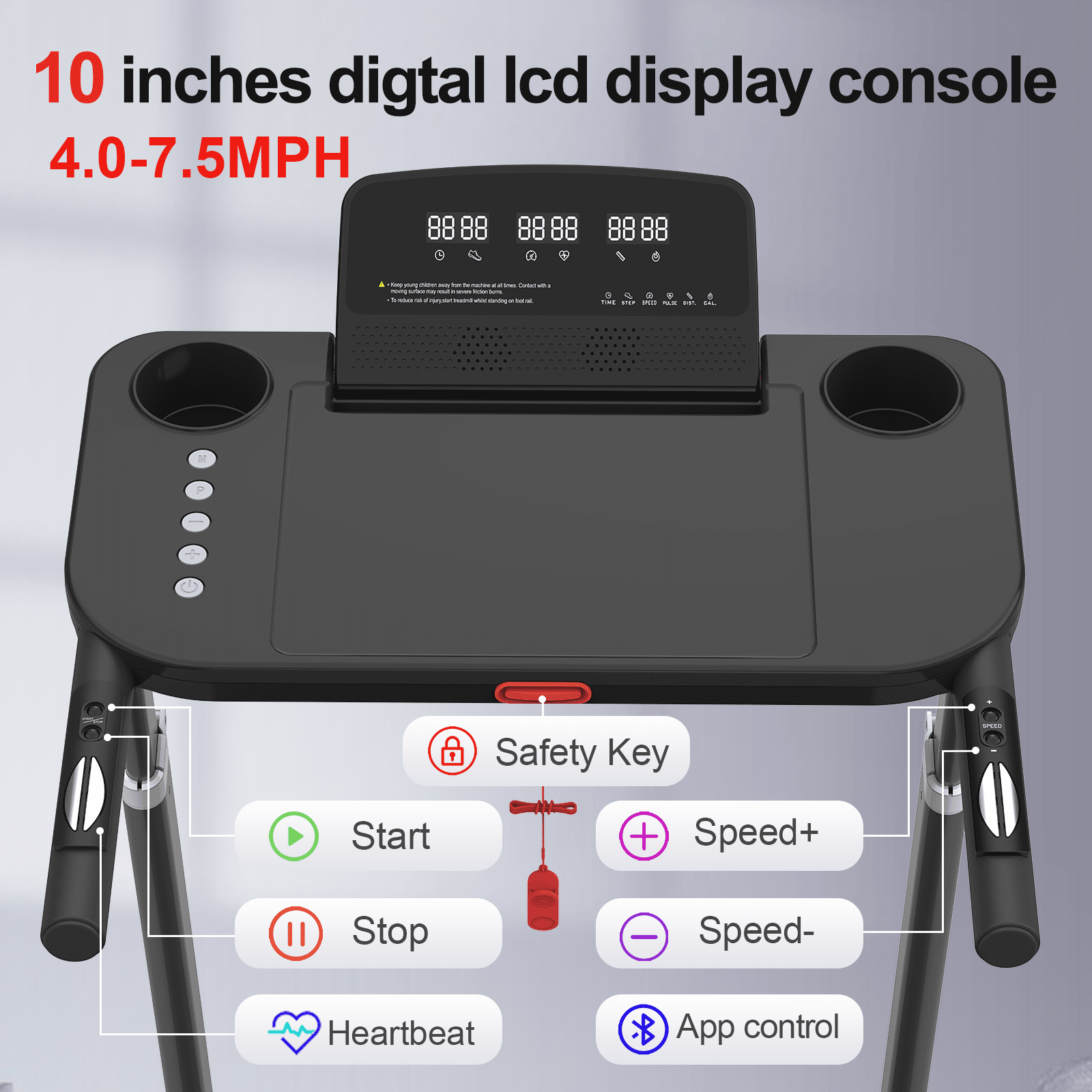 4.[Foldable Design & Easy to Assemble & Quality service]In order to facilitate the user to move and store, the treadmill is equipped with wheels at the bottom, you only need to gently push it to move it to the desired position. When you do not need to use, the treadmill can be easily folded, occupying a small area, easy to store in any corner of the home, saving space.The treadmill arrives 95% assembled and you only need to tighten a few screws to install it.